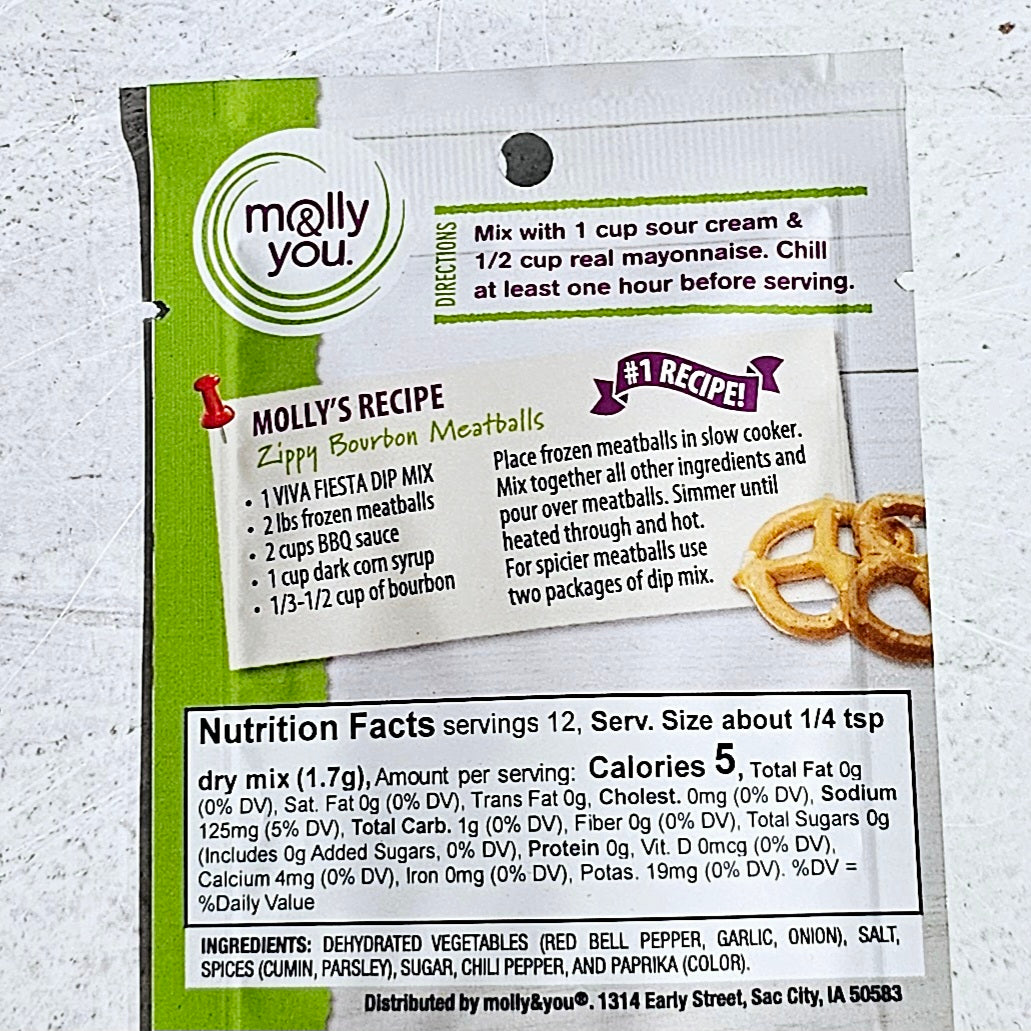 ~ a party dip mix, Viva Fiesta, just add sour cream & mayo. Also there is a recipe for Zippy Bourbon Meatballs on back of packaging.