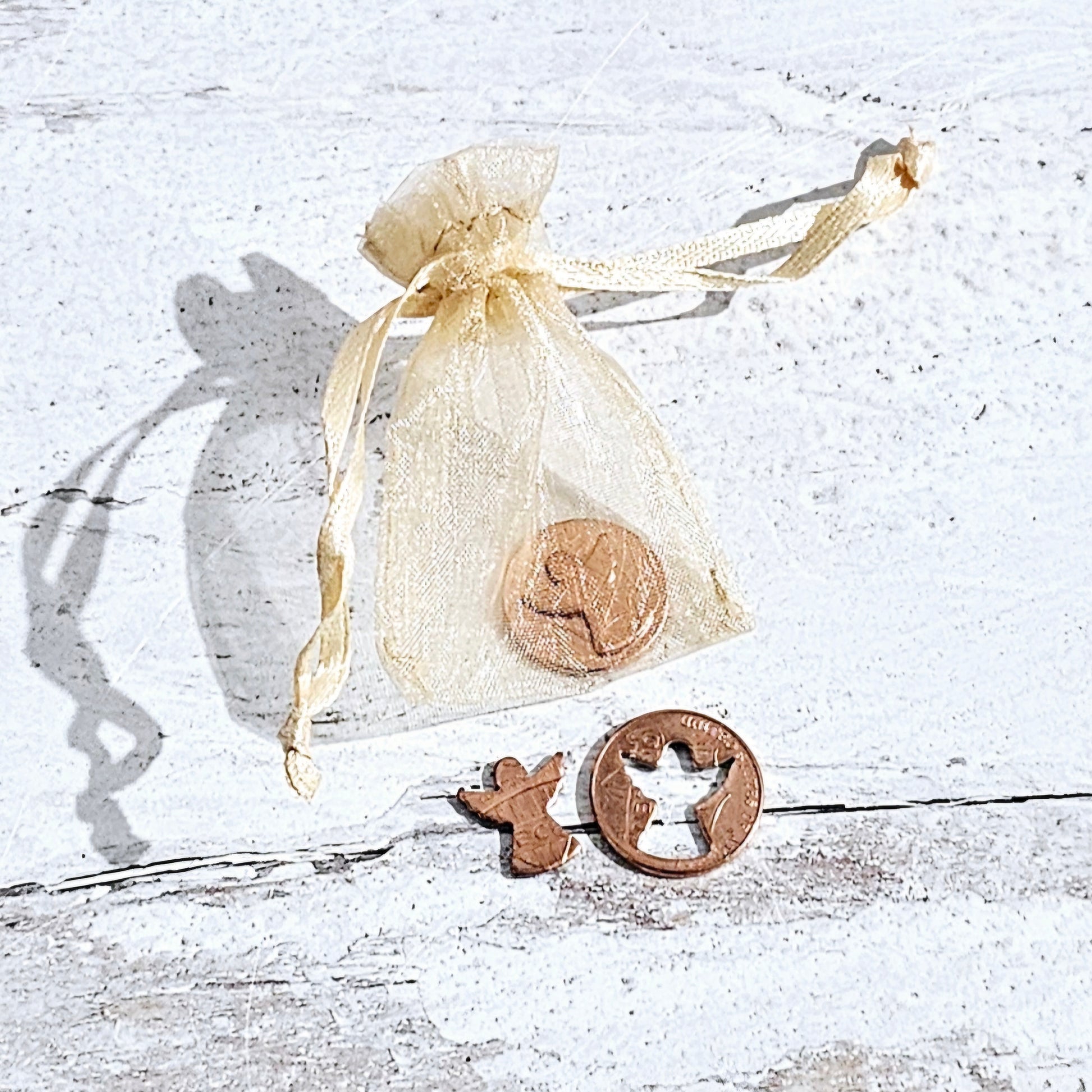 A mesh bag holds an angel cut out penny. A nice reminder you have an angel looking out for you. Sometimes it's just to cheer us or brighten our day or maybe an Angel hug to help along the way. Some choose to place the angel penny to their key chain.