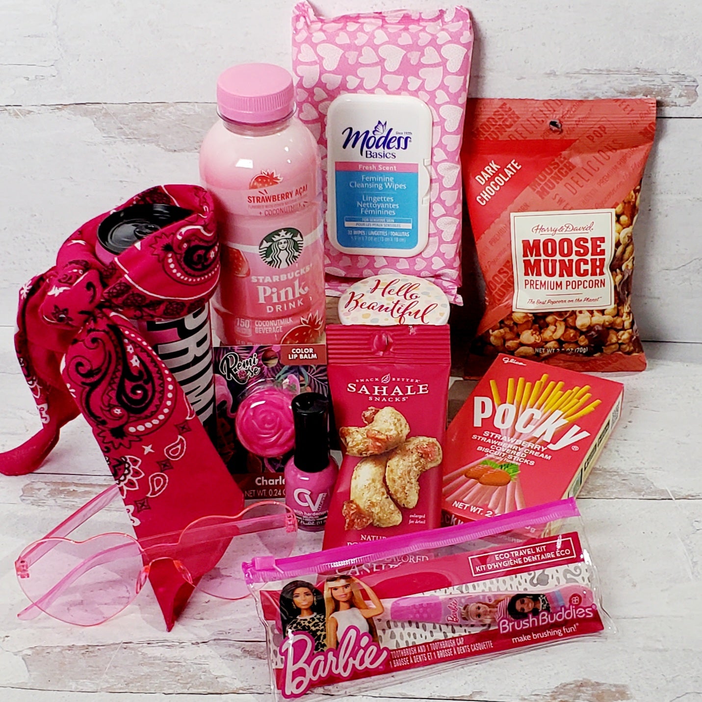 Our Barbie Inspired Gift Box is all about 'being a real girl' and of course everything is pink. Bring Barbie's iconic look to life with this amazing fun kit! Enjoy a classic Starbucks pink drink, along with Sahale nuts, pink nail polish, pink lip gloss and more—all in one beautiful package. What a fun gift for Barbie lover!