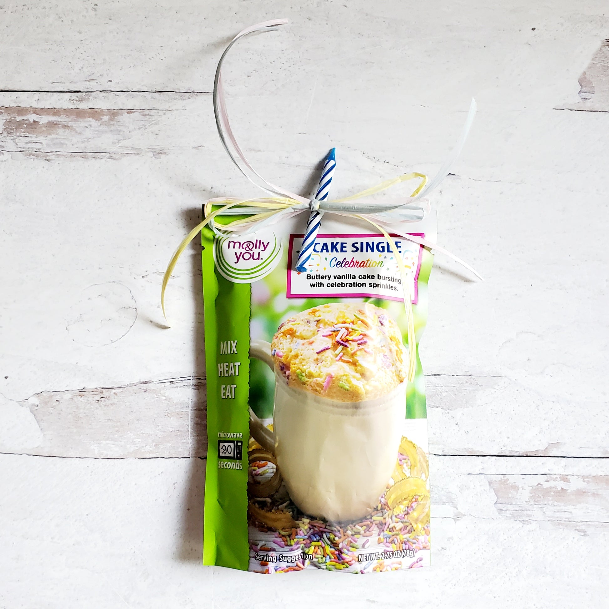 A day to celebrate...YOUR birthday! A Molly & You Celebration buttery vanilla cake with sprinkles complete with candle. Pour mix into mug, add 3 T of water, mix well.