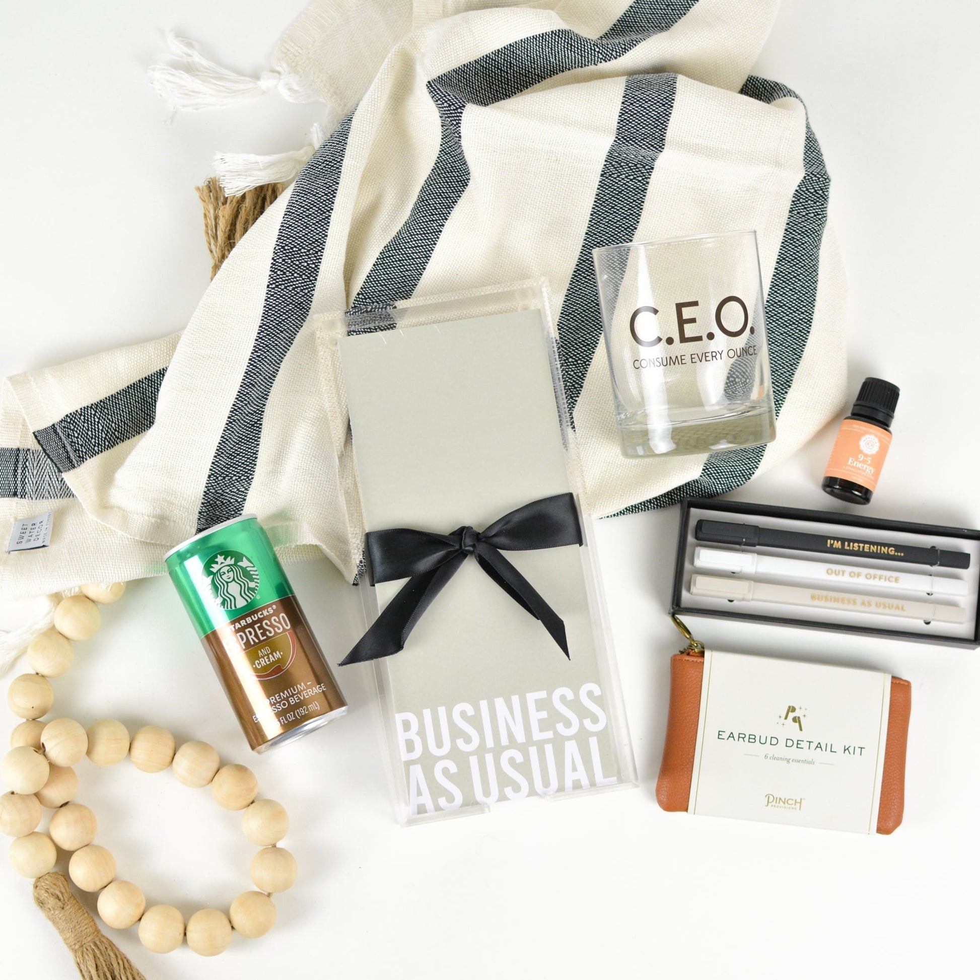 A gorgeous business gift! Includes a "business as usual" note paid set in an acrylic container, along with work themed pens, earbud cleaning kit, Starbucks espresso and a CEO (consume every ounce) glass.