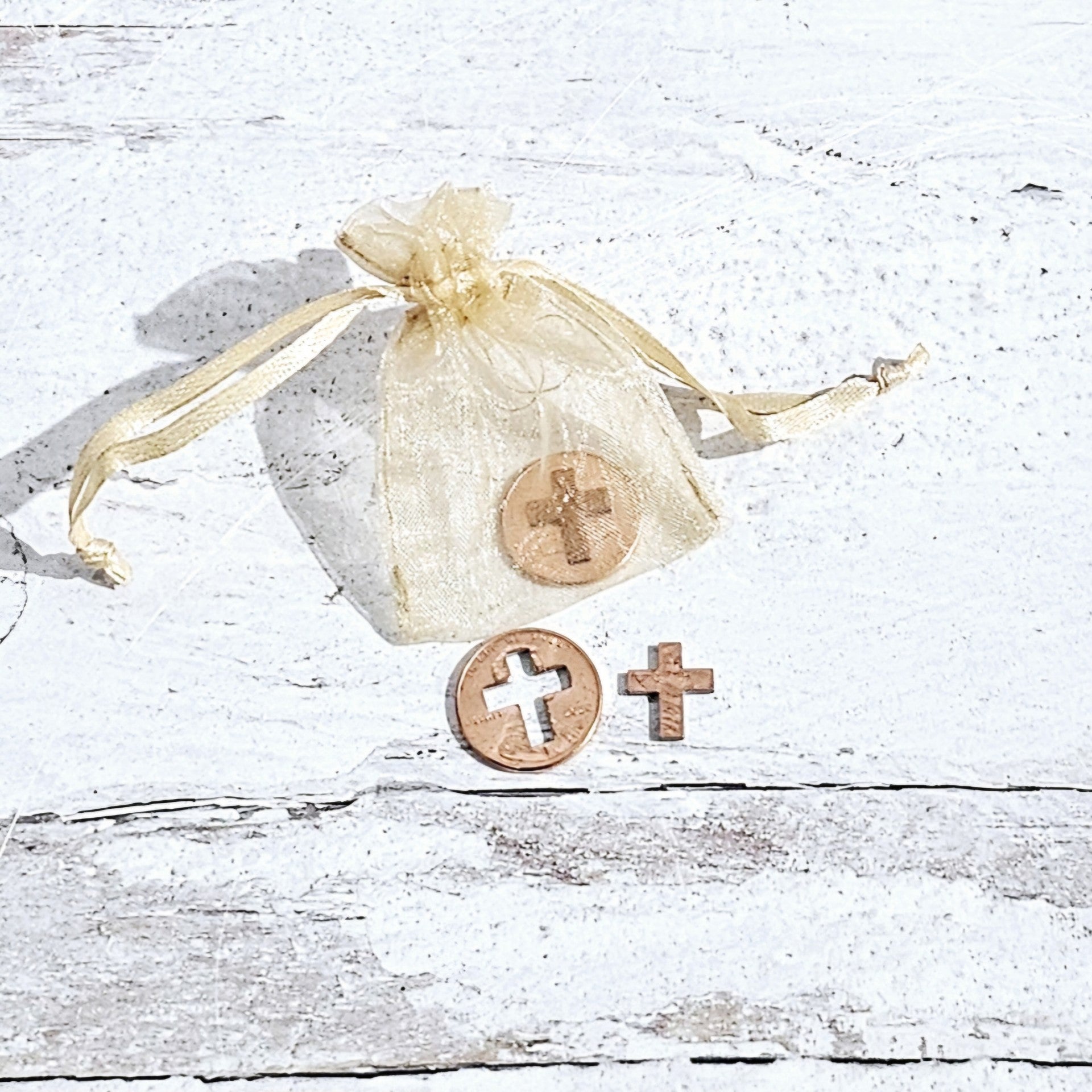 A mesh drawstring bags holds a penny with a cross cut-out. Don't walk by a penny when you're feeling down and blue, the words "In God We Trust" may be Heaven-Cent for you!