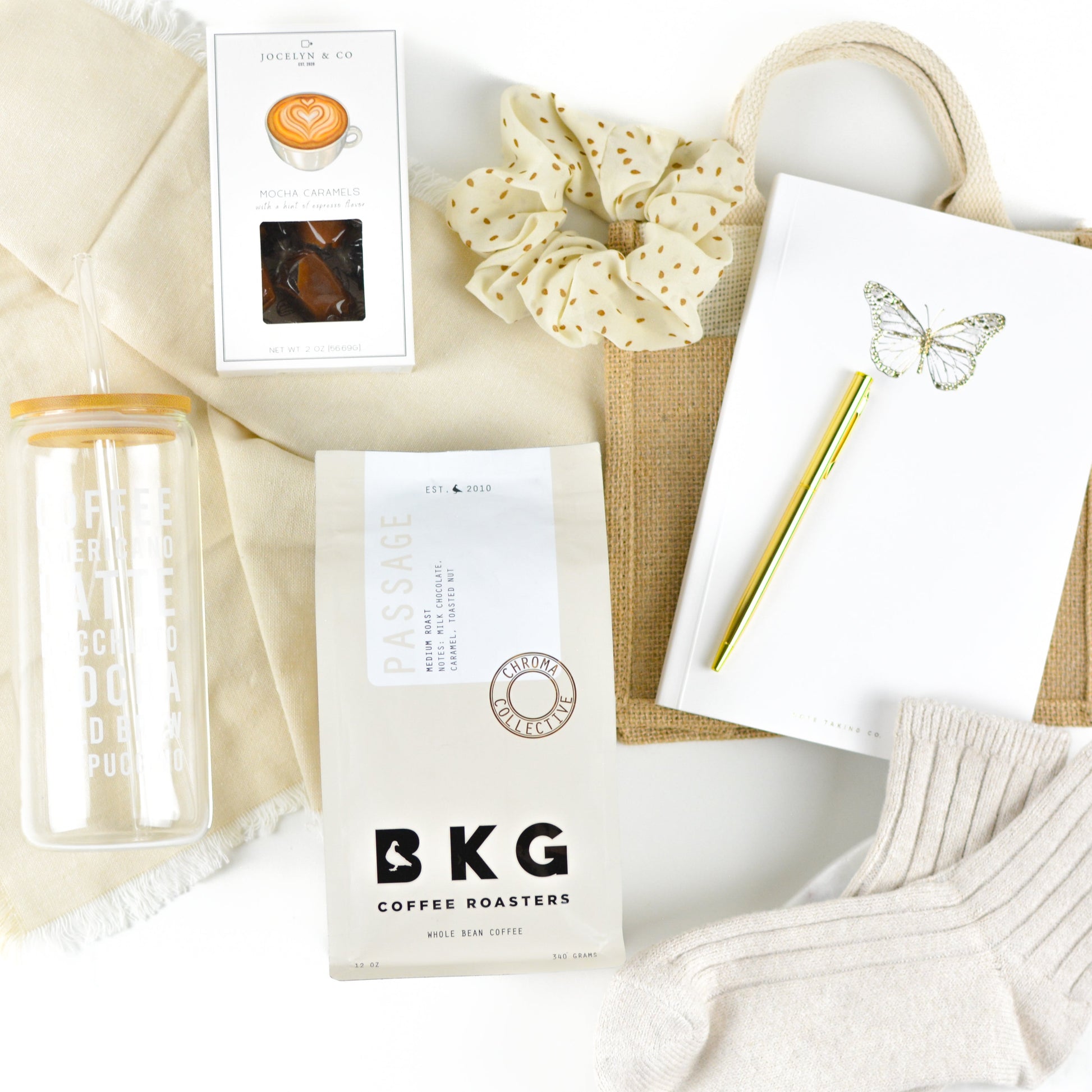 A personal gift for anyone needing to take a time out. Journal with pen, BKG coffee, iced coffee glass with wood lid, mocha caramels, hair tie, comfy socks - all enclosed in a mini jute tote. A gorgeous collection.