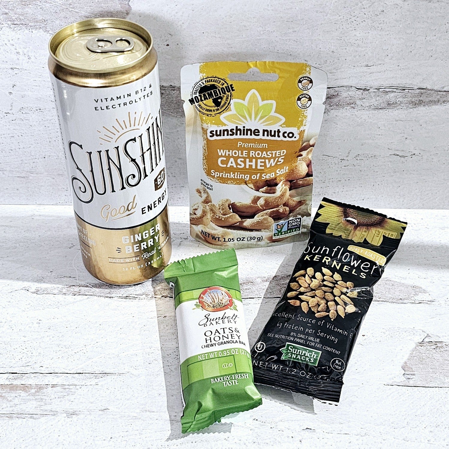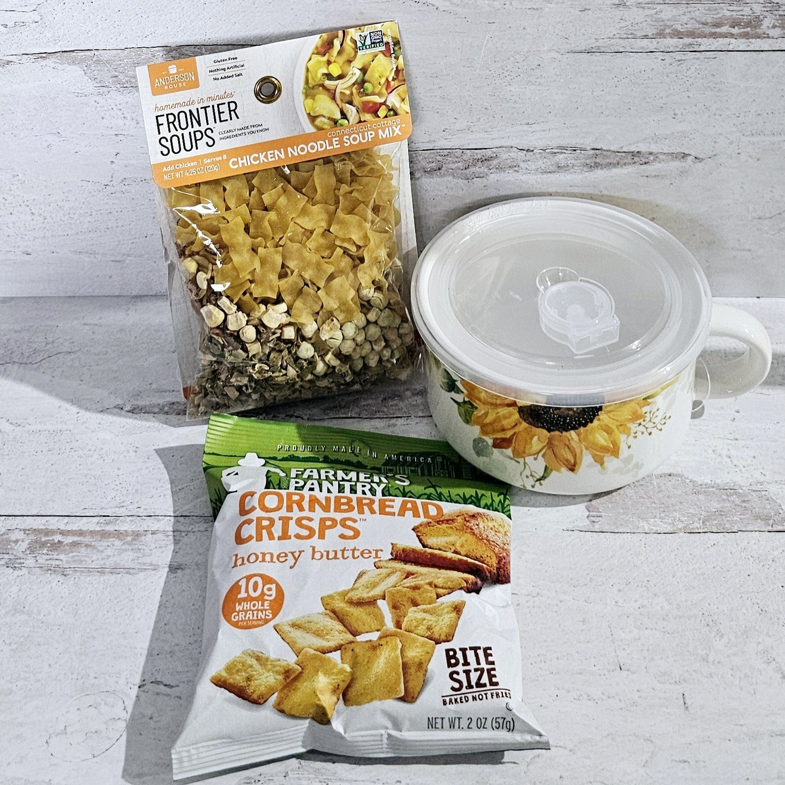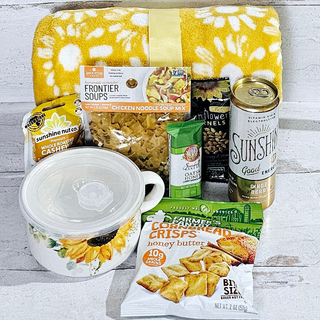 Gift includes SUNshine cashews, SUNflower kernels, SUNshine sparkling energy drink, SUNflower ceramic soup mug, chicken noodle soup, granola bar, plush throw & cornbread crisps. (color may slightly vary on mug & throw)