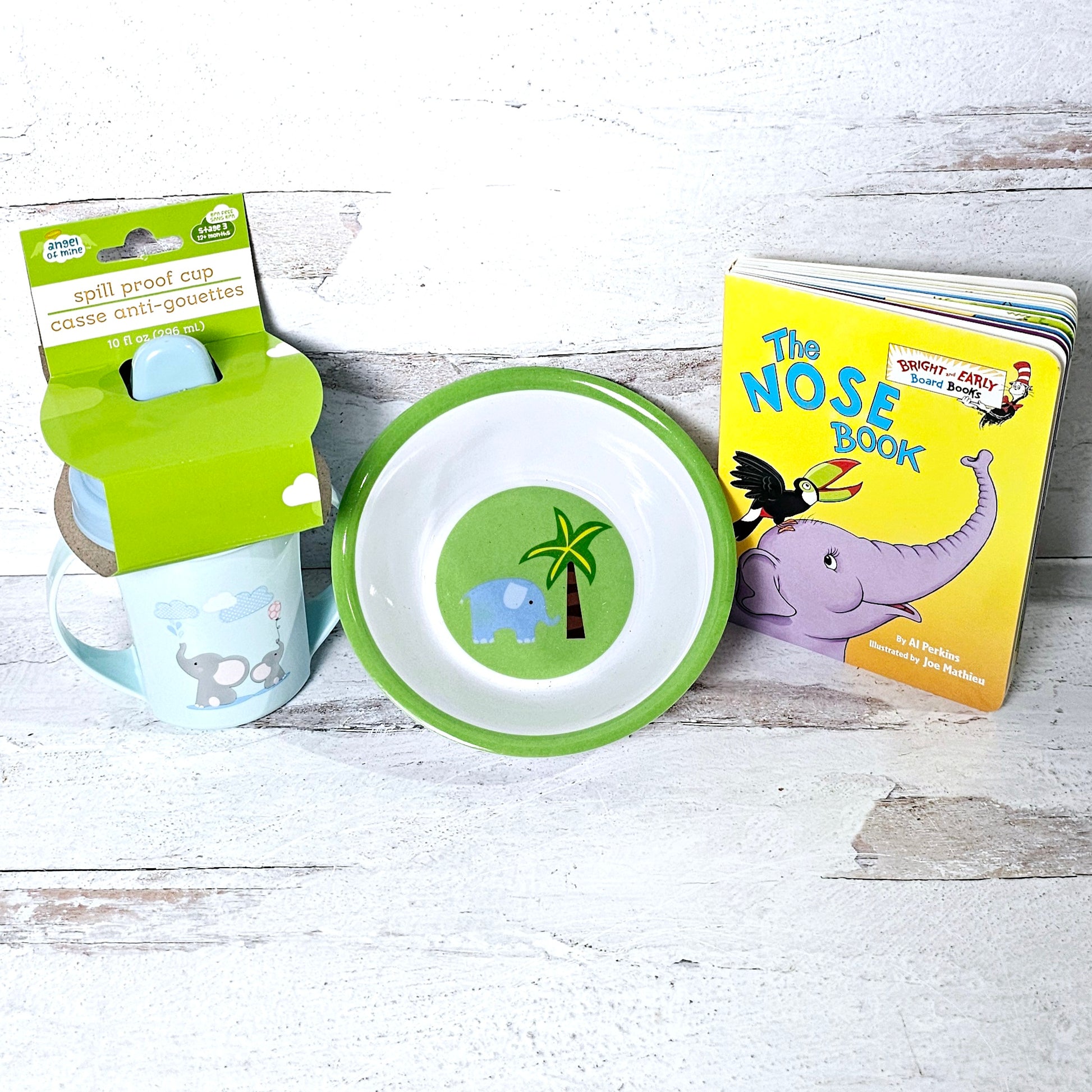 What a cute welcome to the world baby gift. Gift has an elephant theme with a plush toy, blanket, wash cloths, 6-9 mo onesie, receiving blanket, bowl, no spill cup & The Nose Book by Dr. Seuss!