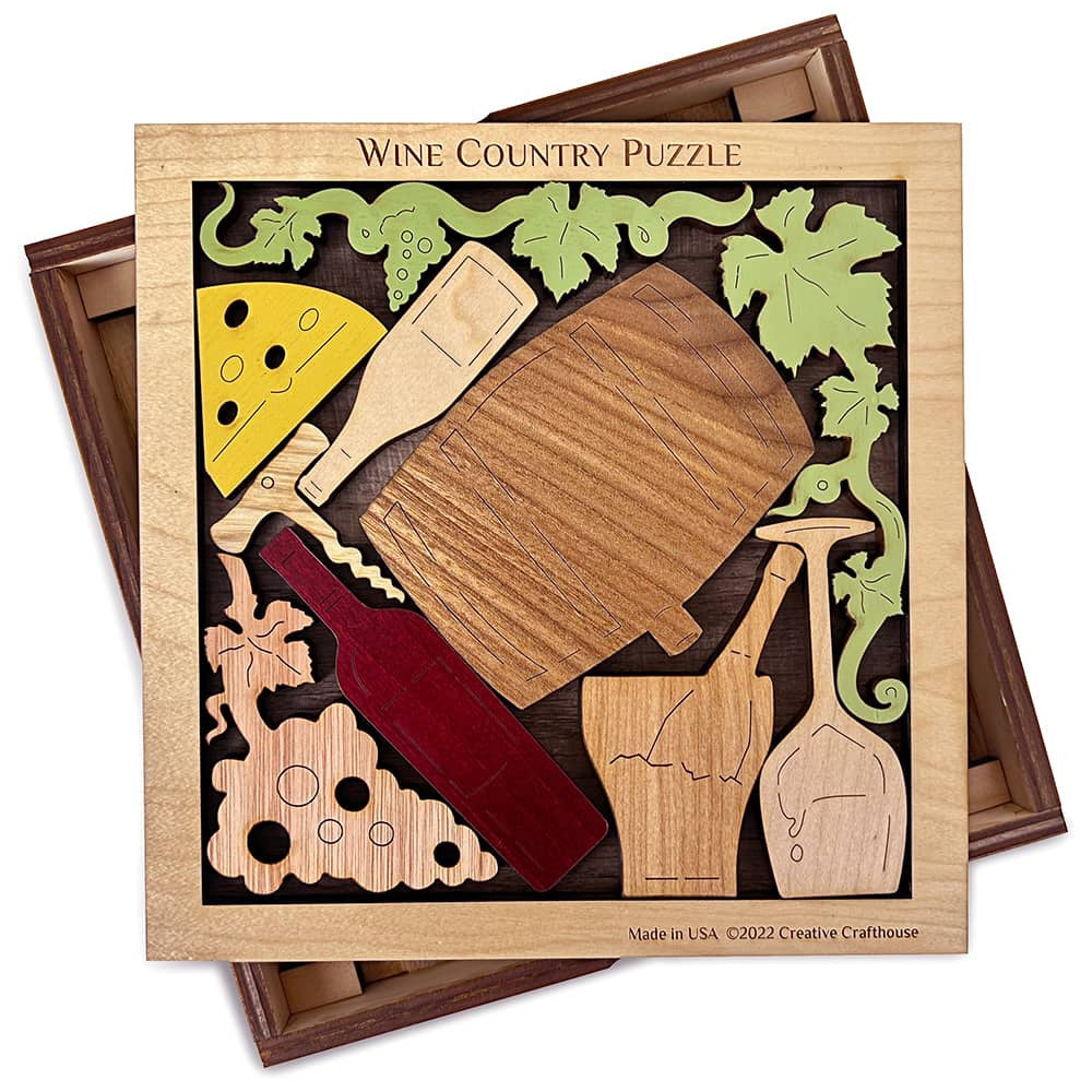This is puzzle is handmade from wood, this unique puzzle is deceptively challenging - and addictive! If you can't fit the 10 puzzle pieces inside the base, you're not a true oenophile! Makes an amazing gift for wine lovers. Size: 7 1/2w x 7 1/2d x 1h"